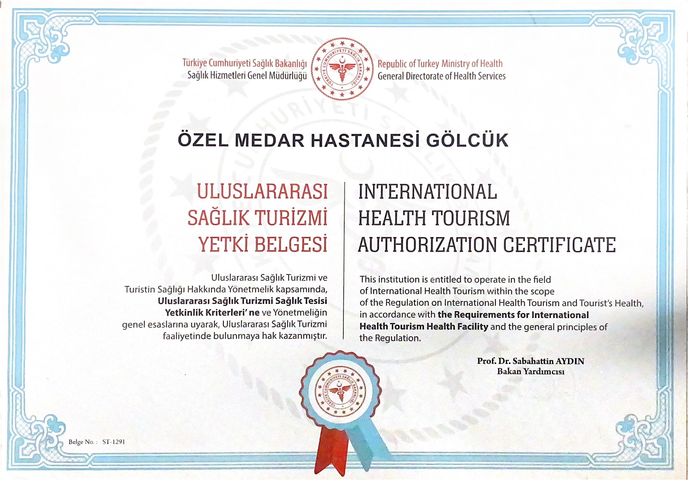 Gölcük Medar Hastanesi Uluslararası Sağlık Turizmi Yetki Belgesi için görsele tıklayınız.